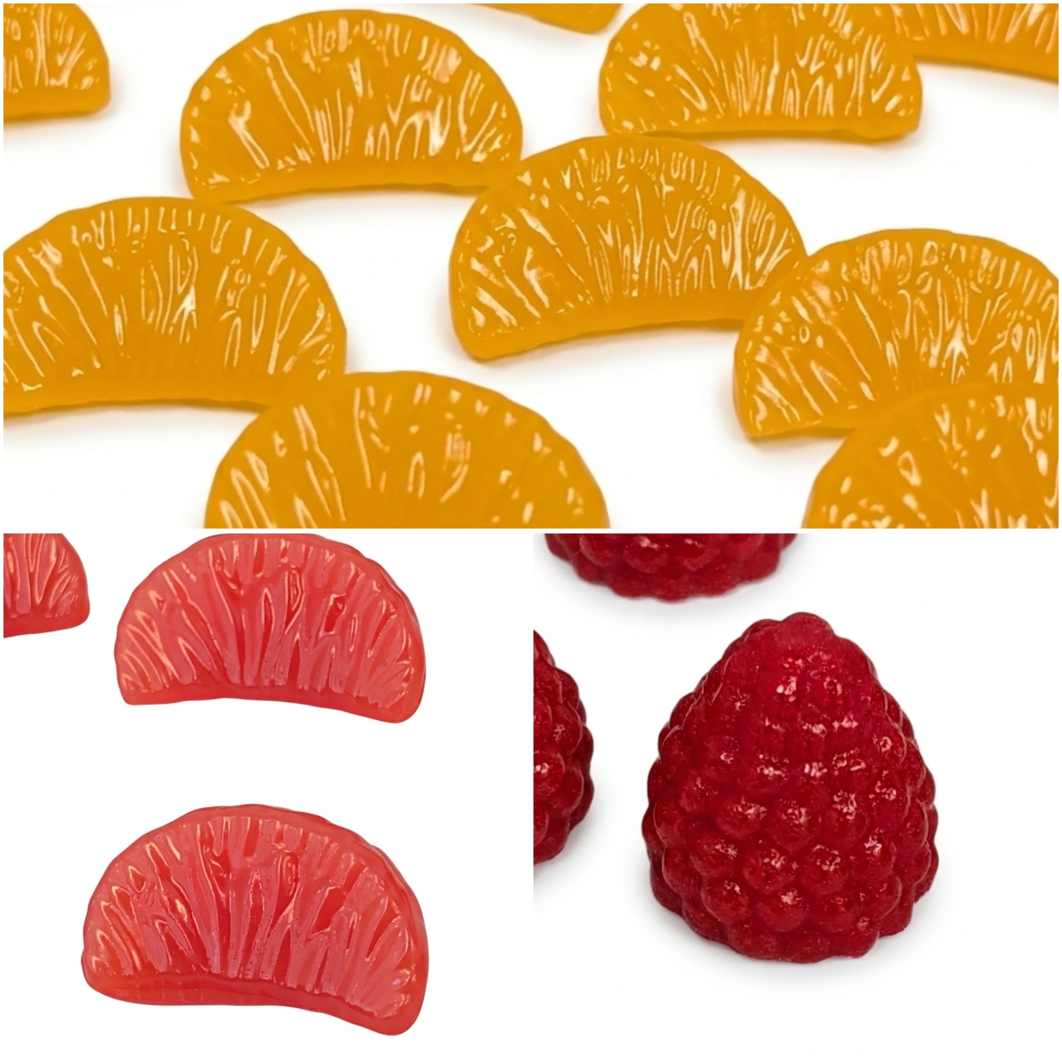 Ingredienser: frukt/bär (hallon, mandarin eller blodapelsin), vatten, honung, citron, glukossirap, agar agar.